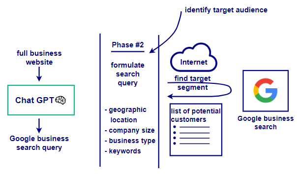 In the second phase, the AI formulates a search query based on the business data gathered in the first phase. As shown in Figure 2, it conducts a thorough internet search to identify potential customer segments by considering factors like geographic location, target audience demographics, and relevant business keywords. The AI then compiles a list of potential leads using tools like Google Business Search to narrow down the target audience.