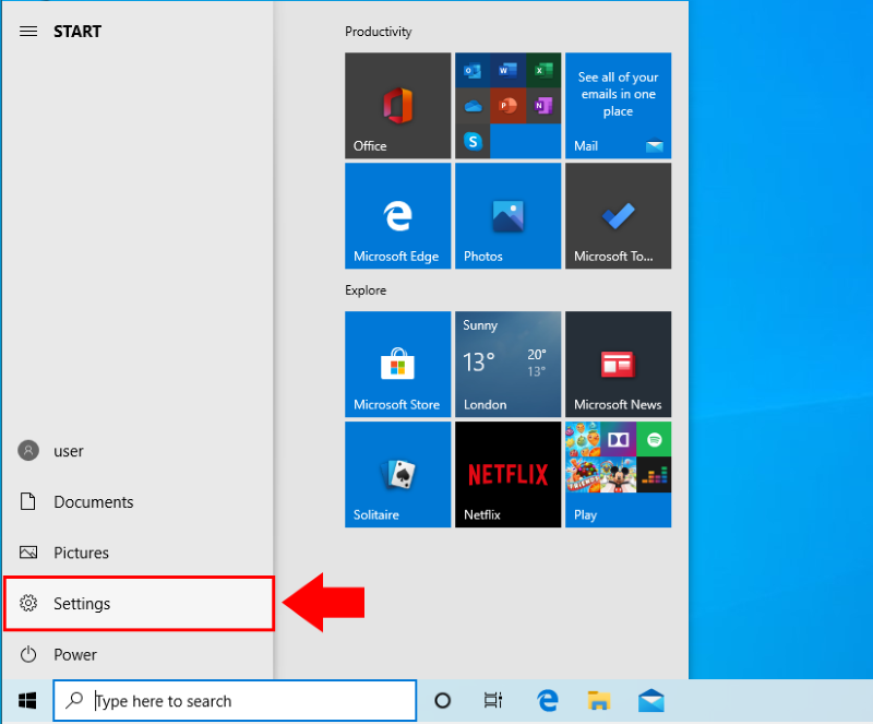 First, to find the built-in application uninstaller, please open the Start menu. You can do this with the Windows button on your keyboard, or by clicking the Windows logo on the left side of the taskbar. Here you will be able to find the Settings button. Click it and it will open windows settings menu. You can see the button on Figure 1.