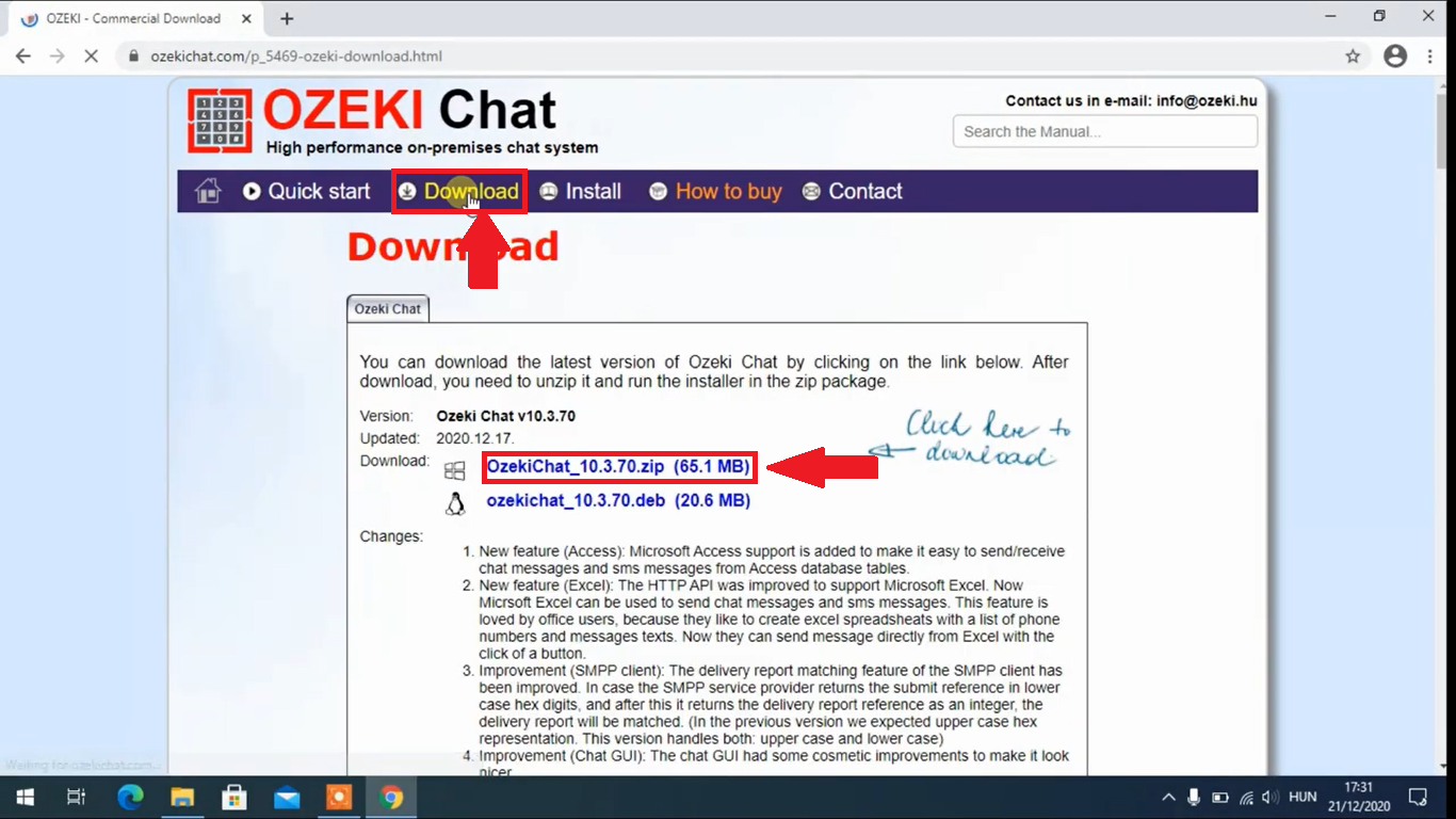 The latest release of Ozeki Chat client can be downloaded from the Ozeki Chat download page. To download the installer in compressed format, you need to click on the first OzekiChatClient_x.x.xx.zip link as Figure 1 shows below. We recommend you to always download the latest version. This version always contains all the currently available features and improvements.
