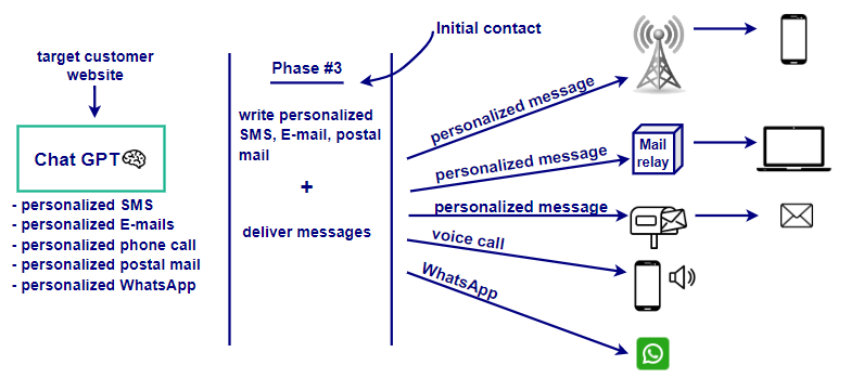 The third phase focuses on communication. As Figure 3 indicates, after identifying potential customers, the AI generates personalized messages using data from the target customers' websites. It creates tailored content for various channels, including SMS, emails, voice calls, and WhatsApp. The AI ensures that these messages are optimized for each communication platform, aiming to maximize engagement with the potential leads.