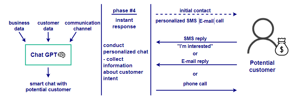 As demonstrated in Figure 4, in phase four, the AI takes immediate action by initiating contact with the potential customers. It sends personalized messages through the most effective channels, whether SMS, email, or phone calls. The AI continuously monitors responses to these outreach attempts, gathering customer feedback, and evaluating levels of interest. It uses this feedback to refine the marketing approach, ensuring that messages are aligned with customer preferences.